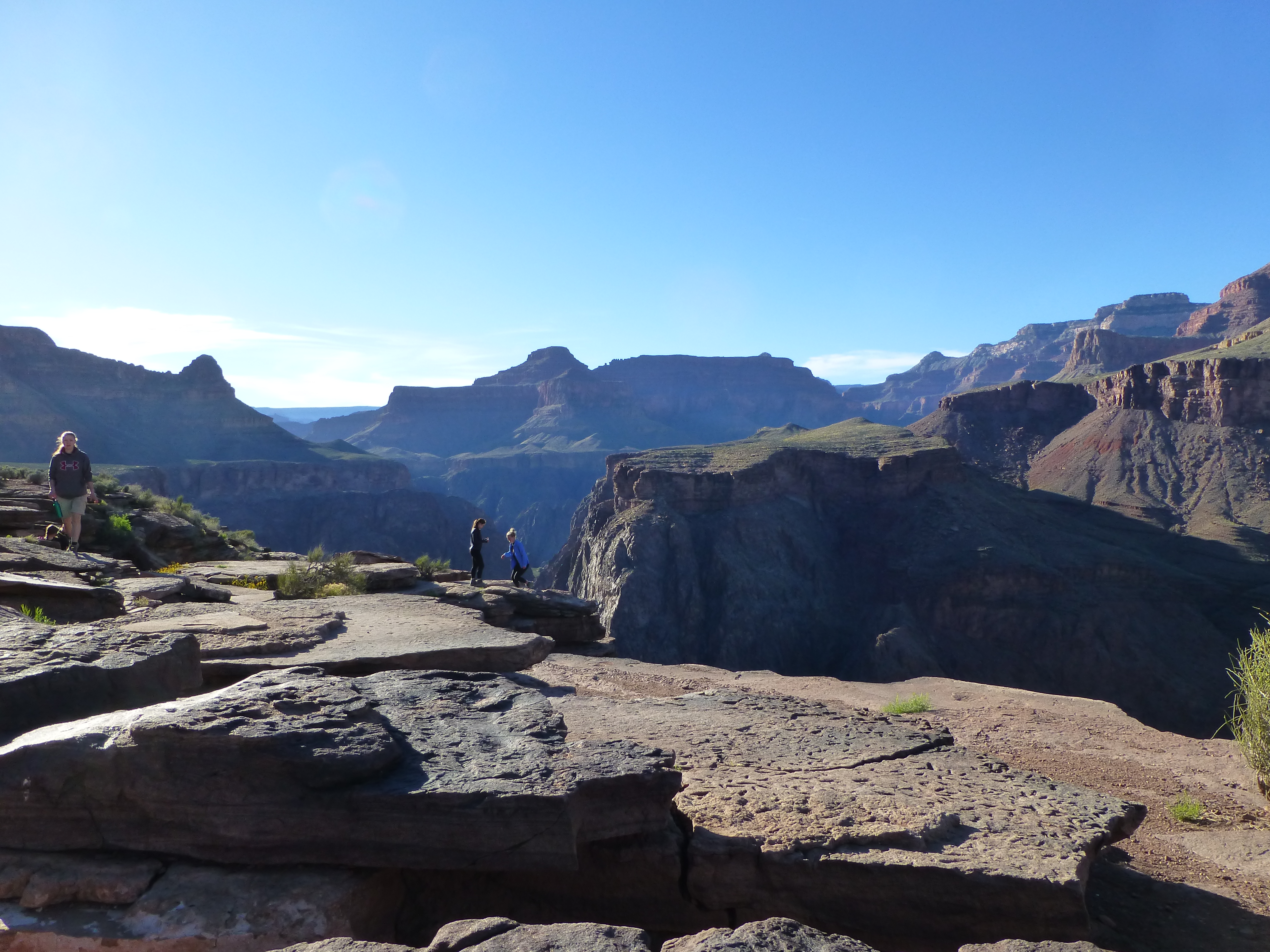 Nathan and I had to throw in one more evening hike. We stopped at the store on the way to satisfy the kids desire to purchase stuff and then continued in the dark to the rim trail. We laid on the trail and watched the stars, planets, planes and satellites. The kids asked Nathan star questions and then those questions turned into existential questions and then to interstellar travel and time questions. Wonder and what if; the kids were full of those questions. I was getting cold laying there so we started walking along the trail. We were waiting for the moon to come up which it did. It lit up the canyon and our trail. We looked down where we had come from that morning and could see the headlamps of the people eating their rehydrated meals at Indian Garden campground.