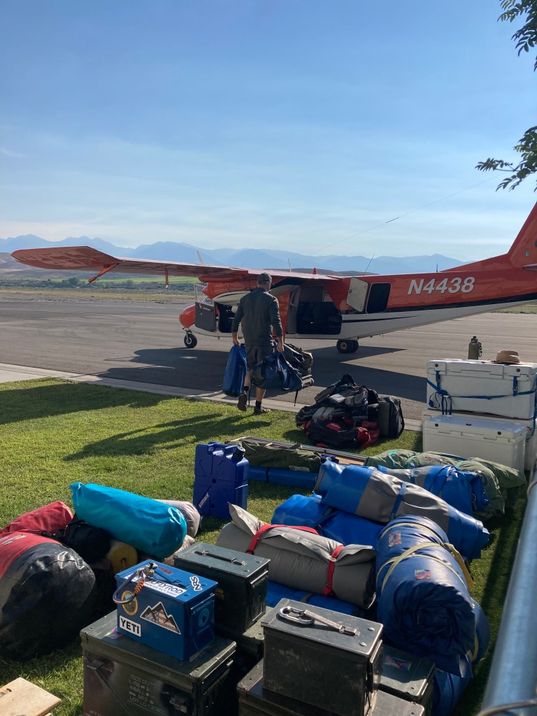 We hit the road at 6:00 a.m., pulling trailers for the take out (no need to disassemble for the takeout as it is an easy drive home, practically in our back yard in Montana measurements). We arrived at the Salmon, Idaho airport with time to spare to walk the dogs and unload the trucks. Flying in river floaters is the main income for this airport; which was nice as they were all on river time.