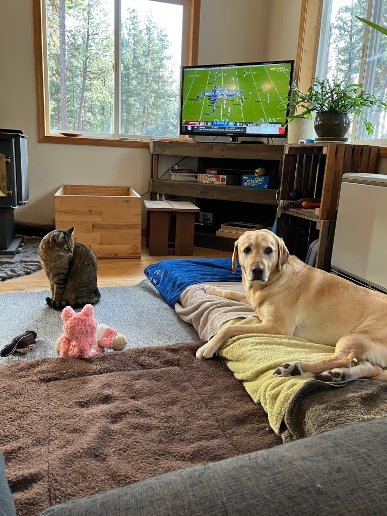 Six weeks ago. Brett, Molly and I were on our afternoon walk up Tin Cup. Planning on doing our loop, when Molly started missing a step with her left leg. Then she started dragging it. I heard it first; the sound of her paw dragging on the dirt road. We walk in the forest and Molly always runs free. She doesn’t even wear a collar. Eventually she started walking behind me struggling more and more to use her left leg. Her paw started buckling under or knuckling as we later learned was the term. I realized she was not going to be able to walk home. We were maybe two miles from the house and I told Brett I would run home and get the car. And I did. A run walk in my hiking boots. We got her home and called the new local vet in town. They said they could see her in five minutes. Away we went as we live five minutes from the vet. They took X-rays and could not determine what was wrong. Gave us some options and sent us home with a bottle of ibuprofen. They said she would have to get an MRI to really know what was going on. The nearest pet MRI being in Bozeman or Spokane. Possible surgery after they determined what was wrong and even that might not be the fix. He said to call in the morning if she got worse.
