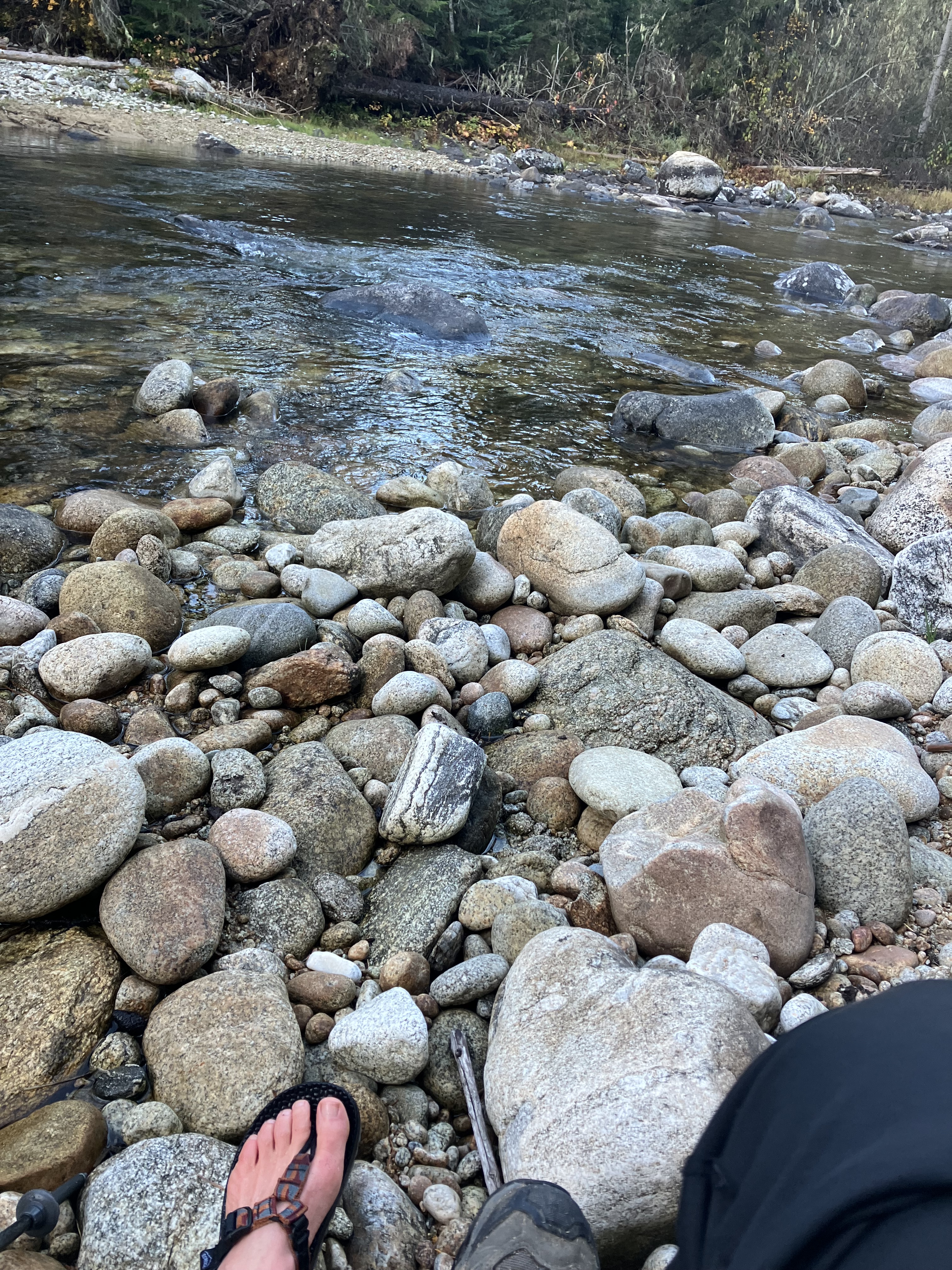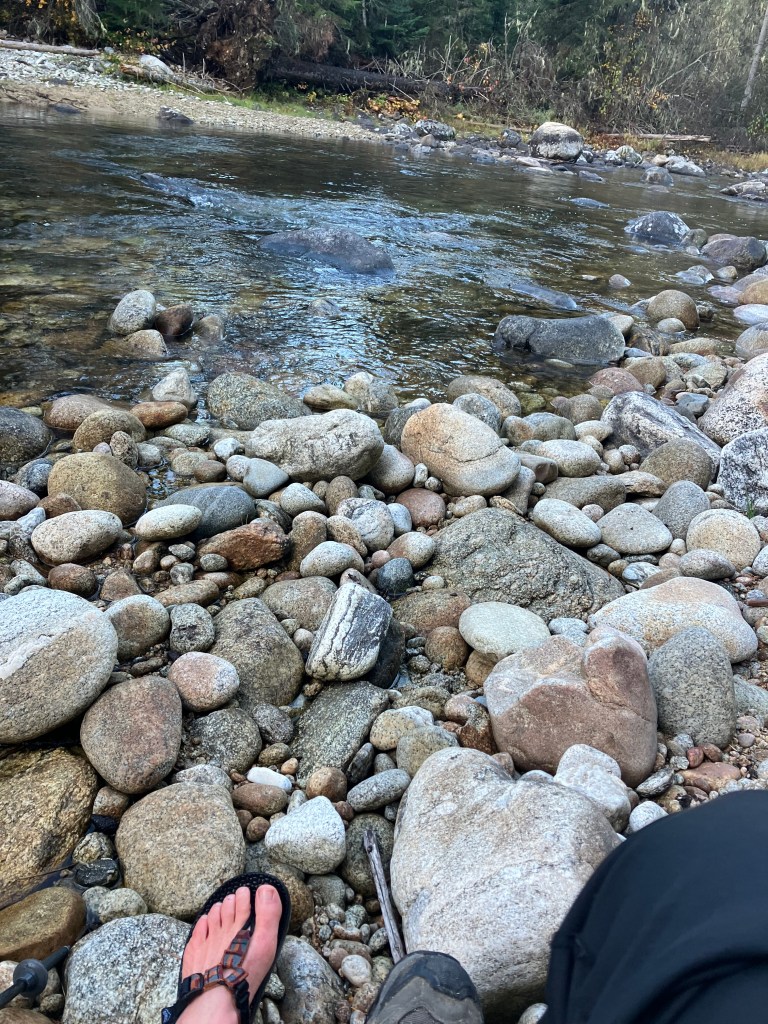 We reached the cabin, but had to cross White Cap Creek (which looks like a river hence the River vs Creek discussion). I brought my good river sandals, weighing several ounces more than my not good river sandals, in anticipation of this crossing. I have fallen at creek crossings before with a full backpack on and it is an upside down turtle scenario as cold water soaks your clothes and seeps into your water resistant boots. No boot is water resistant when the water is pouring in from the top. The creeks in the Rocky Mountains are rocky and once you fall down, it is difficult to make your self vertical again. So. I brought the good yet heavier river sandals. Heidi went barefoot and Nathan had been in the creeks all day with his already wet neoprene booties. His job is to recover the temperature probes (that he had set out in the spring) before the freeze. The water was freezing ass cold. I could feel my feet numbing out half way across and wanted to walk fast but couldn’t walk fast. I’ve got both treking poles in one hand and my boots stuffed with socks in the other hand. It was four in the afternoon and I knew that this crossing was going to be much warmer than when we cross back tomorrow morning.