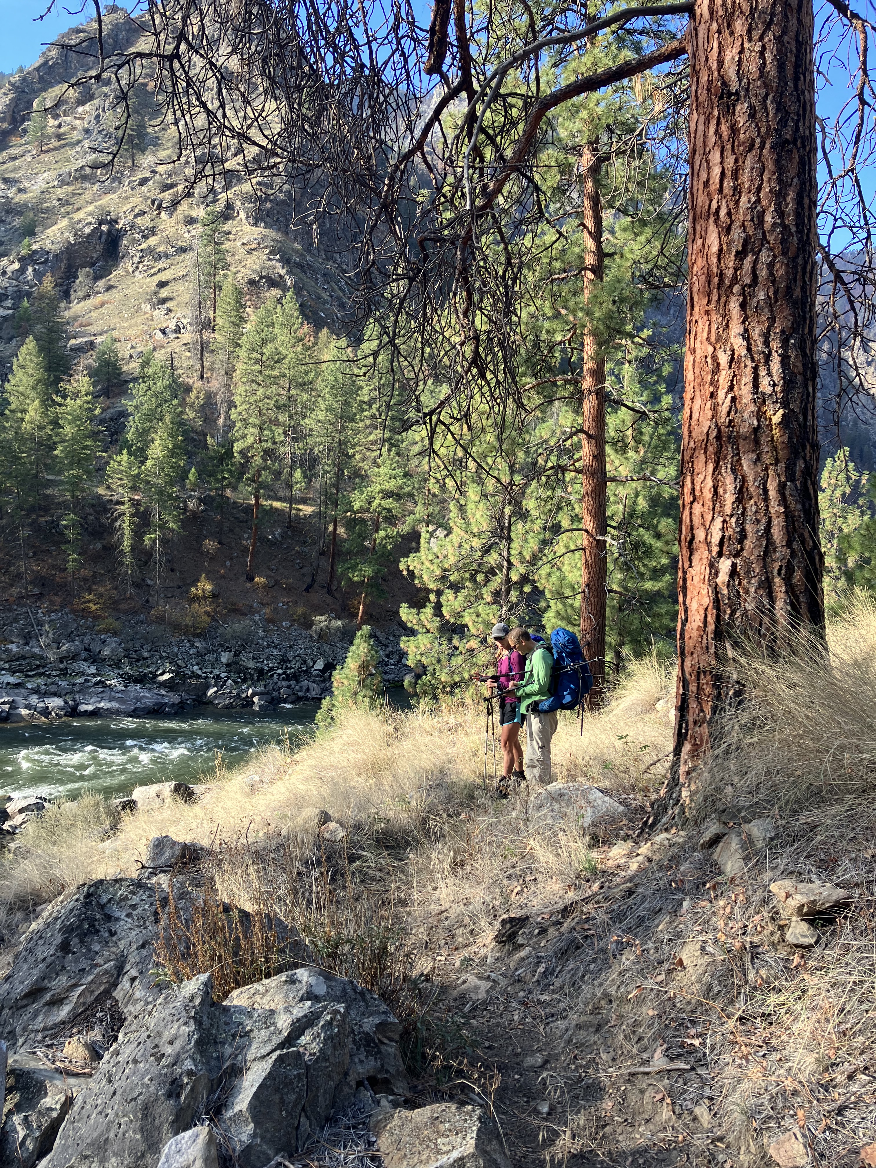 One week later; the three of us were on the road again. Heidi, Nathan and me. This time Heidi and I were official United States Department of Agriculture volunteers. That meant we were able to ride in the forest service vehicle. We left early for the almost 3 hour drive to Corn Creek on the Salmon River. Half of the drive is on a not well maintained, winding, narrow River Road along the Salmon River. With rock cliffs on one side and a steep drop into the river on the other side. The road dead ends at Corn Creek where the trailhead begins. This is also the “put in” for the Frank Church Wild and Scenic River of No Return also know as the Salmon River. If any one asks Heidi or me where we go to church, we reply, “I go to the Frank; the Frank Church. I’ve floated this multi-day stretch of the Salmon River many times and have even camped at our destination, but I’ve never hiked to Lantz Bar.