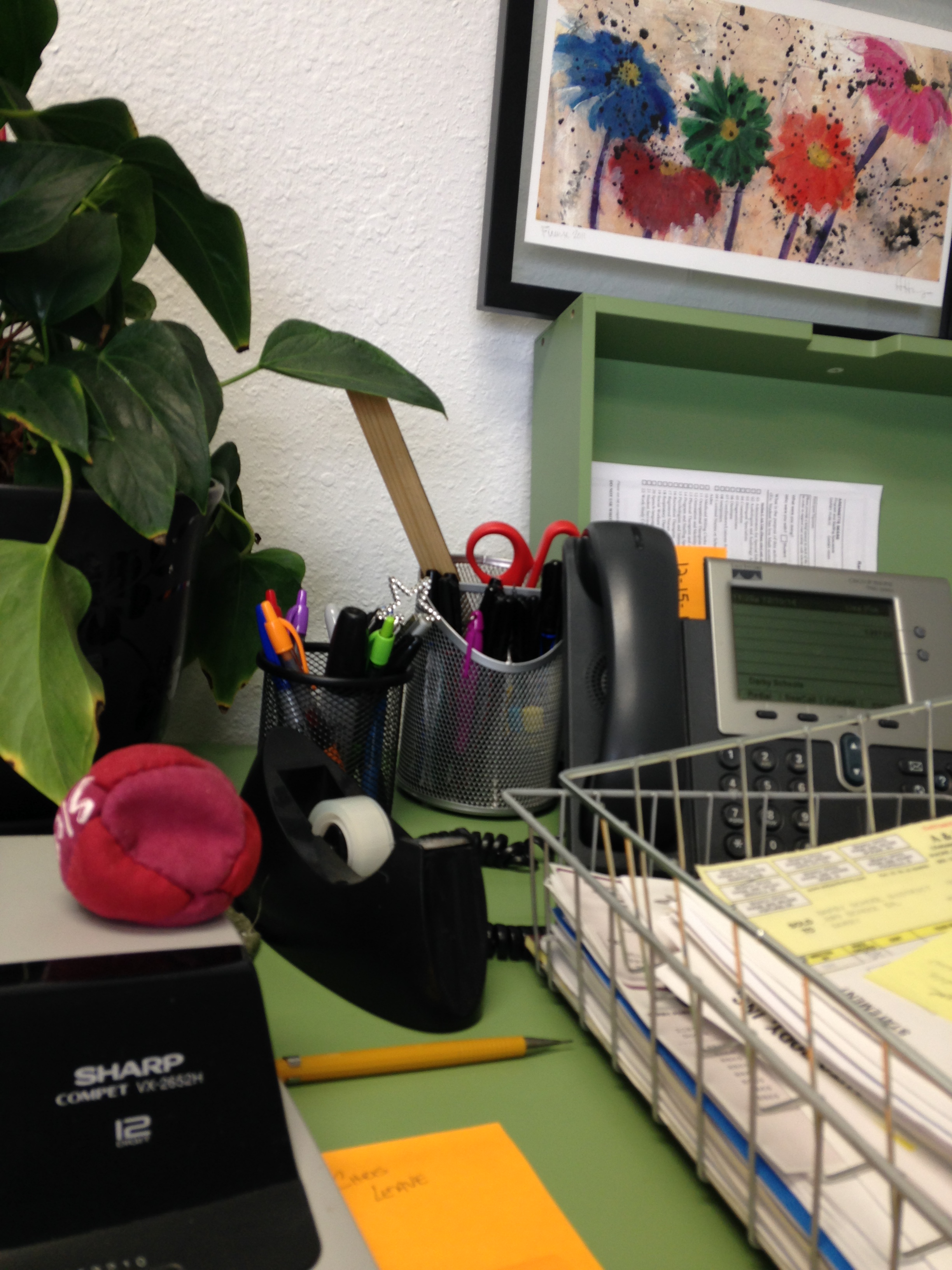 Let’s use an every day example. How do you stay happy every day at your desk job pushing paper, filling out online forms, nagging people for receipts, etc. You can attempt to purchase happiness. A new computer for your desk, a new desk for your office, a new office space with a big window. You can list all of the great things about your job such as the pay, benefits, flexible hours, cell phone, matching retirement plan, etc. No matter how much you try to make it better, you are still at a desk managing super boring, non challenging, uncreative paperwork. Did I say you? I really mean me. What makes me excited to get up in the morning? I choose to be happy. I choose to make off color, inappropriate jokes at work, I choose to send silly emails that make people laugh, I choose to start an administrative book club for some interactive dialog and I have a Happy Sack. Yes, I have a happy sack. Before I moved into my new office with a big window, I had a small closet next to the staff bathroom. In that closet office I had an outside door that took me right to the reader board sign for the school. So I took it upon myself to be in charge of the reader board sign. Usually it was upcoming events like home football games or the next school board meeting. One day just for fun I put up: “Never trust an atom, they make up everything”. Some days I would have students put up the letters for me. Two boys from the 7th grade came into my office to do the reader board. I had to introduce myself, because, as the school paper pusher, I don’t interact with the students and therefore don’t know them. One of the boys eyes got big and a huge grin came upon his face as he looked at the shelving on my wall and exclaimed in excitement; “YOU have a happy sack”. Oh jeez, what does he see on my shelf? What have I brought into my office that could be referred to as a “happy sack”? I slowly turn, scan the shelves and there it is. My hacky sack; now and forever known as my happy sack. It has now moved from the shelves to my desk.